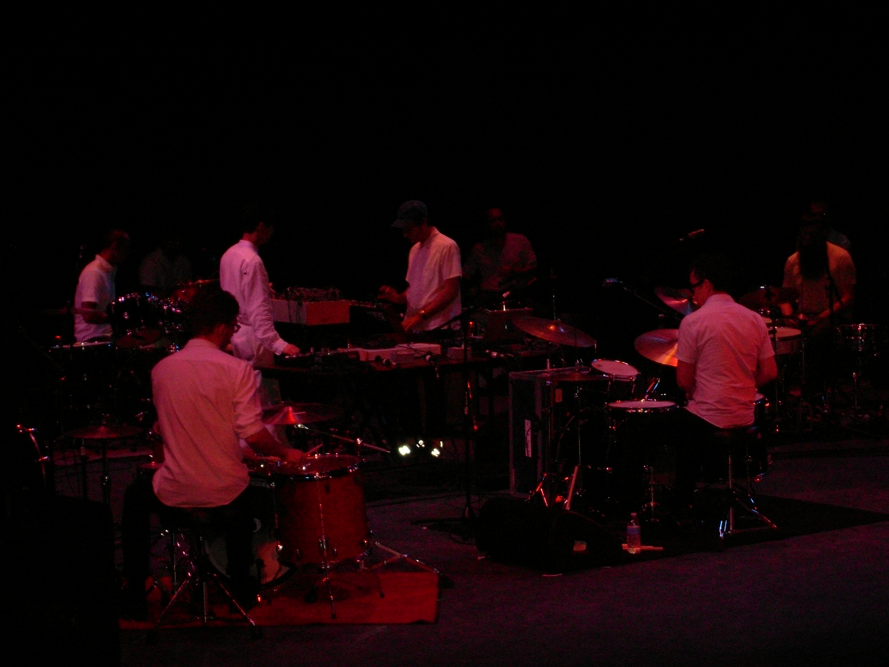 Realizing that I would not melt in the deluge, and after safely stowing my equipment, I trekked the distance to the Fletcher Opera Theater and caught IIII’s (read “Four”) performance. This shifting lineup (of mostly drummers) is one of the more unique additions to this year’s Hopscotch bill. I didn’t think to count the number of drum kits onstage, but let’s just say the Allman Brothers Band would have been jealous. The percussionists created an incredible racket and the energy was electric.